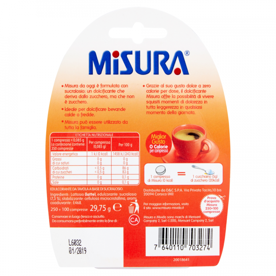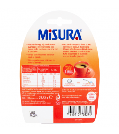 - Благодаря сладкому вкусу с нулевым содержанием калорий на дозу подсластитель Misura дает возможность испытать изысканные моменты сладости во всей легкости в любое время дня. Лучший вкус - 0 калорий на таблетку 1 мерная таблетка (0 ккал) = 1 чайная ложка (5 г) сахара (20 ккал)