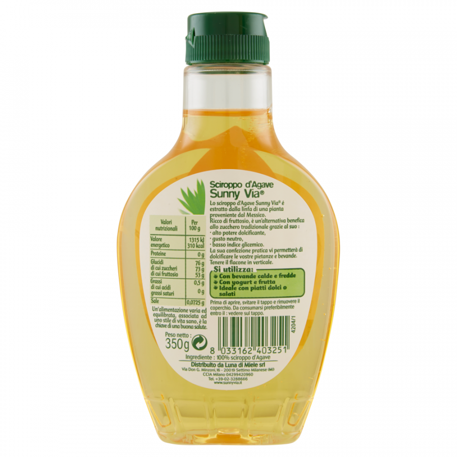 Сироп агавы Sunny Via извлекается из сока растения из Мексики. Богатый фруктозой, он является полезной альтернативой традиционному сахару благодаря: - высокой подслащивающей способности, нейтральному вкусу, низкому гликемическому индексу. Его практичная упаковка позволит вам подсластить блюда и напитки. Держите бутылку вертикально. Разнообразное и сбалансированное питание, связанное со здоровым образом жизни - залог хорошего здоровья.