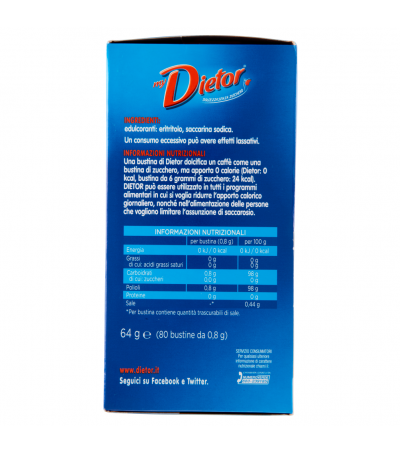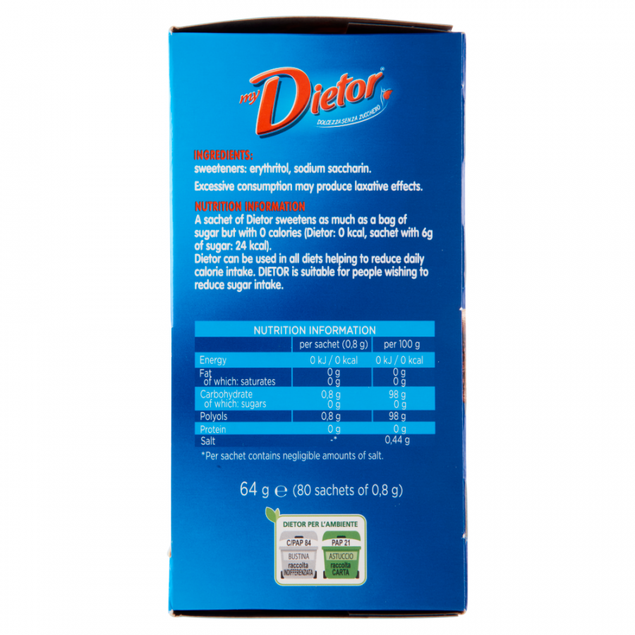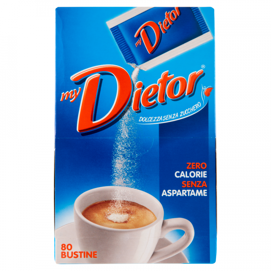 MyDietor, самый любимый итальянцами подсластитель: инновации и качество гарантированы! Без калорий - сладкий, как сахар, легкий, как воздух! Половина чайной ложки myDietor (0,8 г) подслащивает, как пакетик сахара, но с нулевым содержанием калорий, что обеспечивает отличную растворимость для всех напитков. Без аспартама! Чистая сладость! MyDietor, чтобы обеспечить лучший вкус, использует новую формулу на основе сахарина и эритрита. Эритритол - специальный ингредиент, улучшающий органолептические характеристики новой формулы. Мы отбираем только лучшие ингредиенты для получения сбалансированной формулы и однородной сладости. Выразите все свои творческие способности на кухне, не жертвуя вкусом и легкостью. MyDietor подходит для приготовления пищи даже при высоких температурах. Идеально подходит для приготовления тортов, десертов и вкусных фруктовых салатов. Тщательный отбор сырья и контроль производственного процесса MyDietor гарантируют высокое качество этого продукта.
