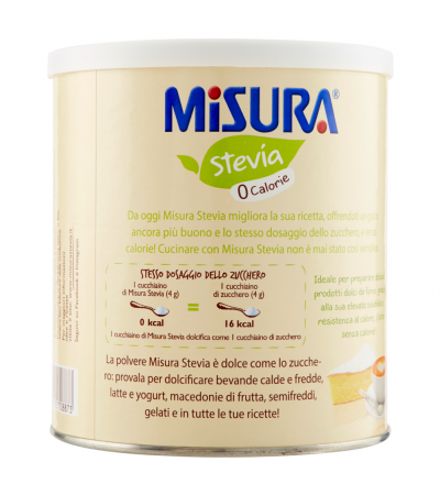 1 чайная ложка Misura Stevia (4 г) 0 ккал = 1 чайная ложка сахара (4 г) 16 ккал. Порошок стевии Misura сладок, как сахар: попробуйте подсластить горячие и холодные напитки, молоко и йогурт, фруктовые салаты, парфе, мороженое и во всех своих рецептах!