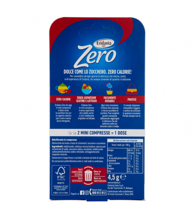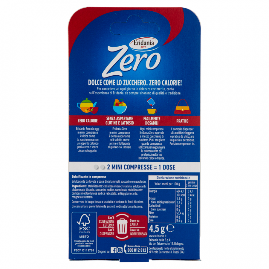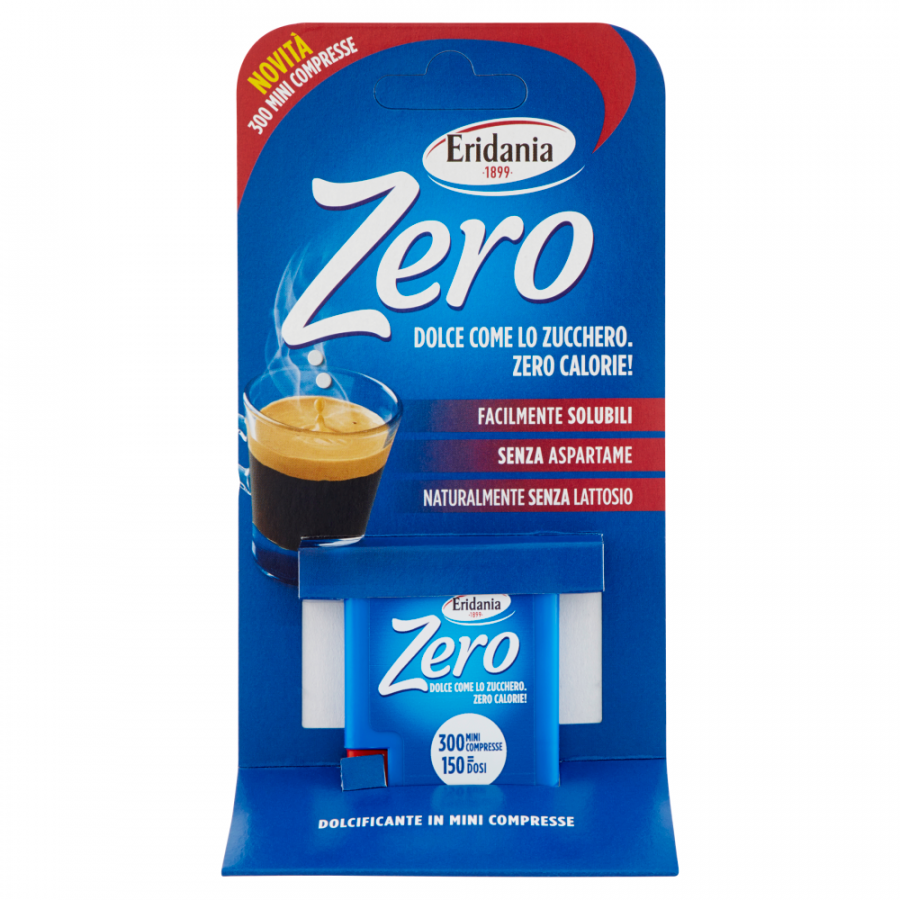 Сладкий, как сахар. Никаких калорий! Чтобы каждый день дарить сладость, которой он заслуживает, положитесь на опыт Эридании, который всегда был синонимом качества и традиций. Нулевые калорийности Eridania Zero с сегодняшнего дня в мини-таблетках - сладкий, как сахар, но с нулевым потреблением калорий и без какого-либо послевкусия. Не содержит аспартама, глютена и лактозы. Легко дозируется. Каждая мини-таблетка Eridania Zero эквивалентна половине чайной ложки сахара. Вы можете выбрать, сколько таблеток использовать для достижения сладости, которую вы предпочитаете в горячих или холодных напитках. Удобный ультратонкий диспенсер - легкий и практичный в любом случае. Всегда носите его с собой. 2 мини-таблетки = 1 доза