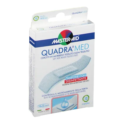 Quadra Med - пластырь из нетканого материала, снабженный впитывающей подушечкой с дезинфицирующим веществом (хлоргексидина диглюконат 0,5%). Гипоаллергенный клей, не содержащий растворителей и натурального латекса. Он имеет эксклюзивную запатентованную эргономичную форму. Используется в основном для лечения ран с повреждением дермы, которые могут зажить вторичным натяжением. Его функция - контролировать микросреду раны и создавать барьер с внешней стороны. Показан при небольших поражениях, в частности, при наличии нежной, чувствительной и раздраженной кожи.