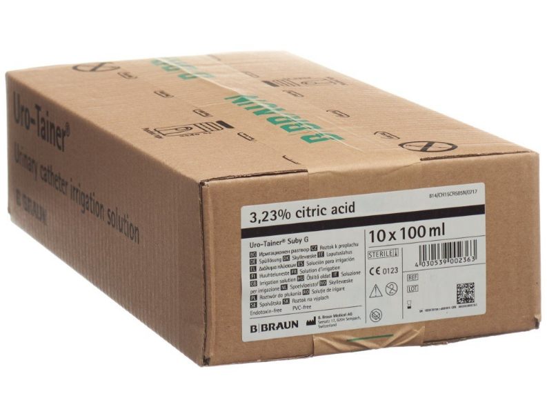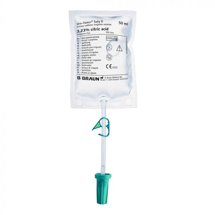 Uro-Tainer Suby G 3,23% с лимонной кислотой — это стерильная система для промывания катетера и мочевого пузыря.